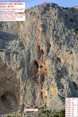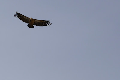 Com mais um largo, ficámos ao nível do voo dos abutres, que desde cedo pairavam à nossa volta, certamente pouco felizes por terem companhia. Digo isto, pela reacção de um deles, que perto de poisar a poucos metros de nós, já com o trem de aterragem quase a tocar na rocha, resolveu dar meia volta e dirigir-se para outro poiso quando os seus olhos negros se cruzaram com os nossos esbugalhados. Pela reacção, creio que fomos classificados como intrusos, os verdadeiros indesejáveis!