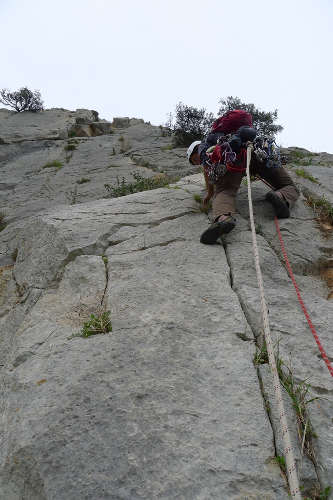Quando os pássaros começaram com o seu chinfrim habitual ao nascer do sol, abandonámos o quentinho da tenda e cerca das 9:30 estávamos na base da parede com tudo preparado para começar a escalar.