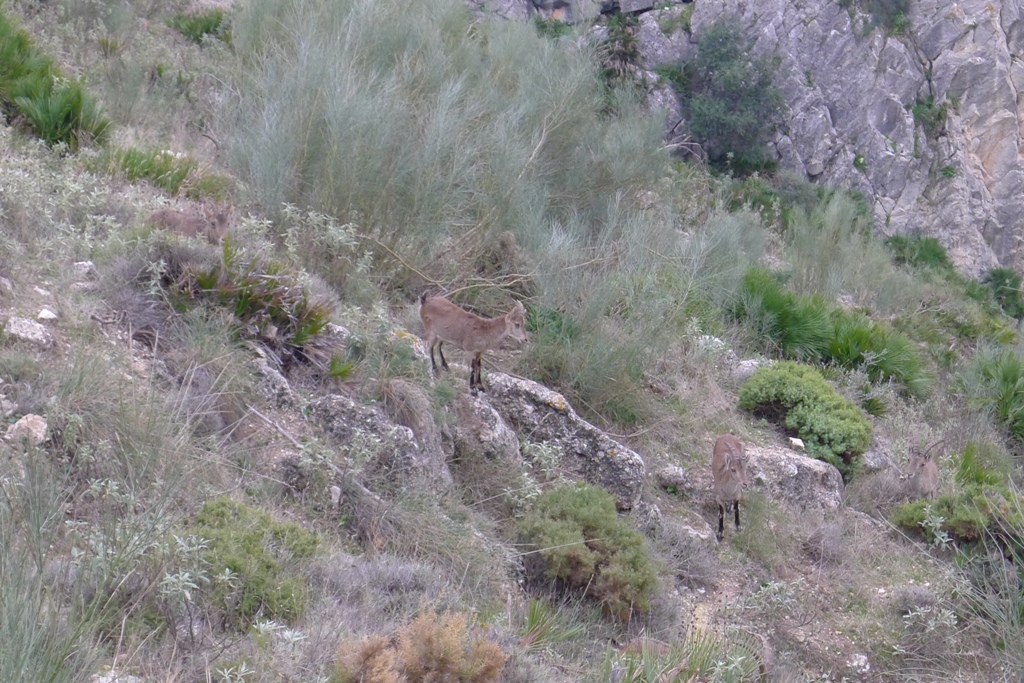 Tínhamos entretanto uma hora e quinze minutos para descer até ao carro antes que a escuridão caisse dos céus mas, sem conhecer o caminho! O Paulo tinha a ideia de que, de alguma forma deveríamos ir ter às Escaleras Árabes e descer por aí. De facto tinha razão. Munidos do factor sorte, rápida e facilmente fomos dar ao trilho das Escaleras Árabes, sendo saudados pelo caminho por um batalhão de cabras que por ali passeava.