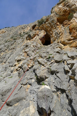 Mas o mais espectacular do momento não se prendia apenas com este factor, mesmo por cima das nossas cabeças, desenhava-se uma fantástica fissura que cortava a placa de calcário compacto numa diagonal para a esquerda. Uma daquelas fissuras impossíveis de não escalar, de não gostar, de não desfrutar. UÁU!